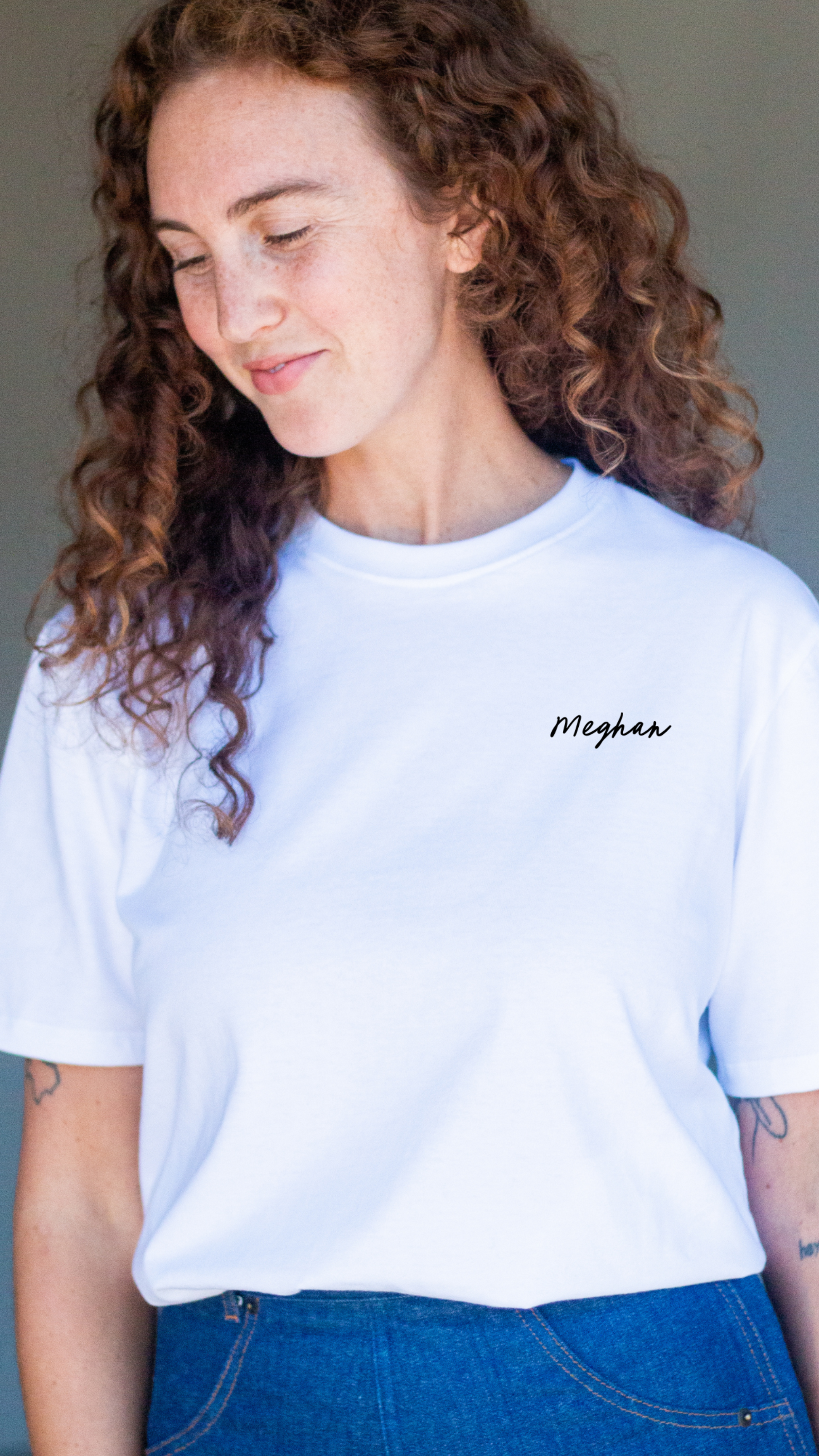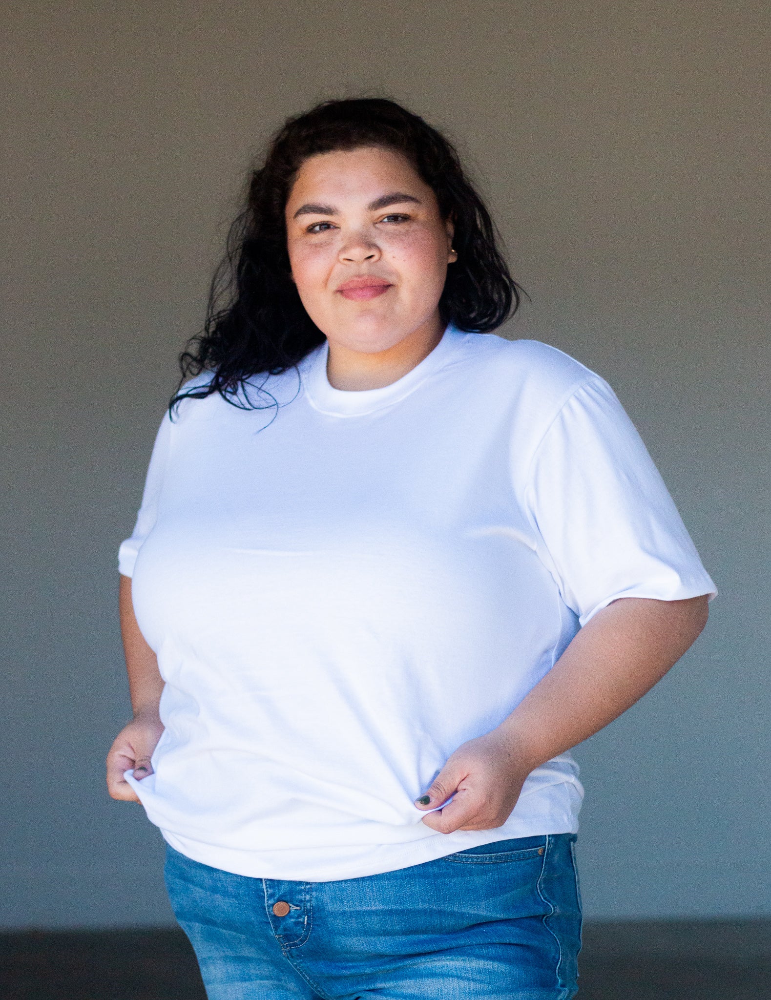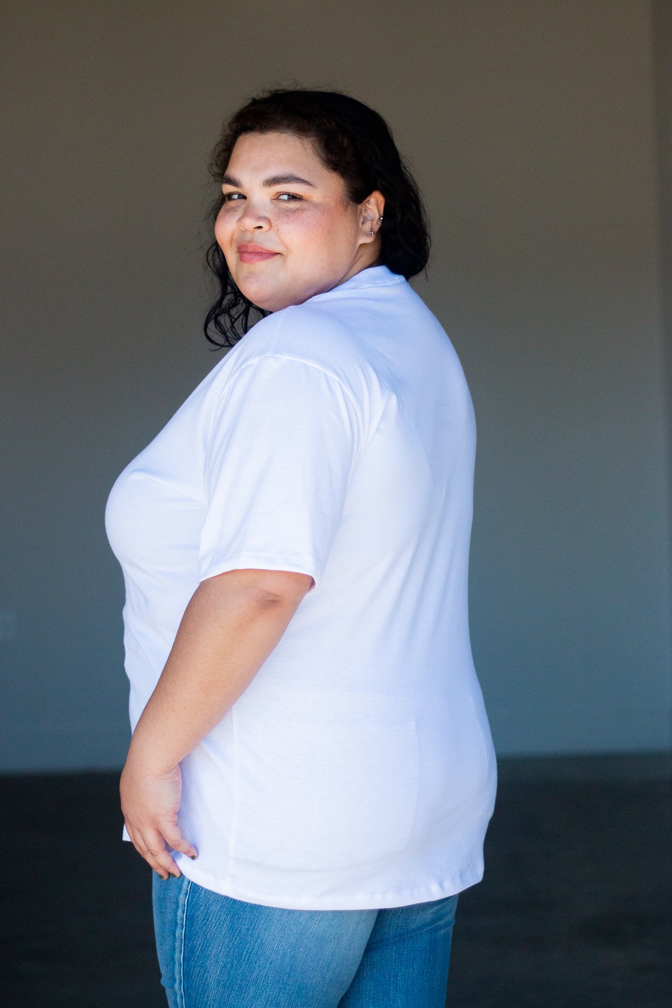 Rebecca is wearing a size XL in The Retro in white.